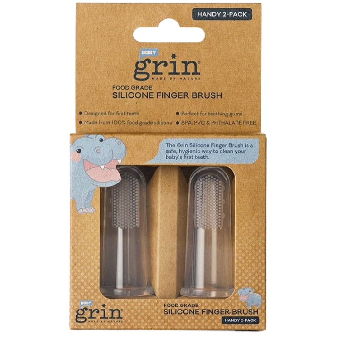 Grin Baby Silicone Finger Brush 2 Pack is thoughtfully designed for baby's first teeth, the double-sided finger brush offers a soft brush side to gently clean teeth, with a dimple side on the back to massage sensitive gums. Made from food-grade silicone and safe to sterilise. Encased in 100% biodegradable packaging.